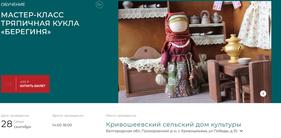 Приобретение билетов по Пушкинской карте по ссылке https://bel.cultreg.ru/events/194312/master-klass-tryapichnaya-kukla-bereginya